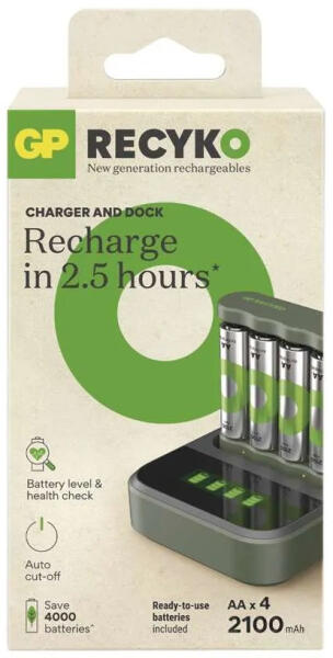 A legfontosabb paramétereka feltöltött cellák méreteAAA, AAegyidejűleg töltött akkumulátorok száma2 vagy 4csatlakozó típusaUSBtöltő típusaintelligensEgyéb paraméterekcellák típusa a csomagolásbanAA ReCyko 2 100töltési csatornák száma2alkáli elemek érzékeléseigentöltési idő AAA 1 000 mAh2:30 - 3:30töltési áram AAA300 mAtöltési idő AA 2 700 mAh4:00 - 8:00táplálásUSB 5 V/1 Acellák száma a csomagolásban4a feltöltött akkumulátorok típusaNiMHsérült elemek érzékeléseigena csomagolt cellák töltési ideje3:00/6:00tápkábel (tartozék)micro USBtöltési áram AA770 mA/380 mAfordított polaritás elleni védelemigenmárkaGPméretek75 × 85 × 25 mm