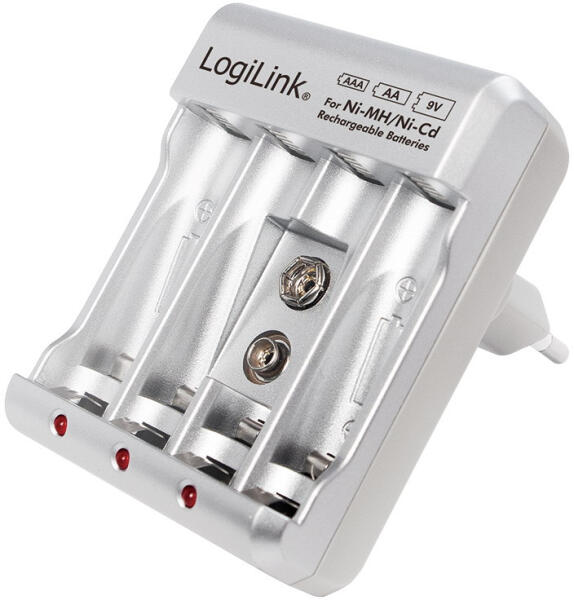 Ezzel a töltővel 2db vagy 4db AA/AAA, vagy 9V-os Ni-MH/Ni-Cd újratölthető akkumulátor tölthető Három LED piros színnel mutatja az akkumulátorok töltési állapotát Túltöltés elleni védelemmel és állandó áramerősséggel/feszültséggel, amely meghosszabbítja az akkumulátor élettartamát Bemenet: 100-240 V AC, 50/60 Hz, max. 80 mA Kimenet: 2,4 V DC 400 mA, 200 mA x2/x4 (AA), 100 mA x2/x4 (AAA), 30 mA x 1 (9 V) Töltési idő: kb. 16 óra (AA), 12 óra (AAA), 9 óra (9V) Mérete: 79 x 64 x 80 mm Súly: 60g